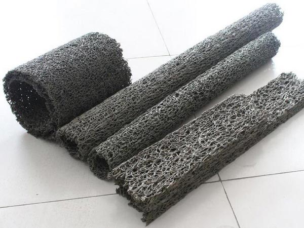 塑料盲溝是由塑料芯體外包裹濾布組式。塑料芯體是以熱可塑性合成樹脂為主要原料,經過改性,在熱熔狀態下,通過噴咀擠壓出細的塑料絲條,再通過成型裝置將擠出的塑料絲在結點上熔接,形成三維立體網狀結構。